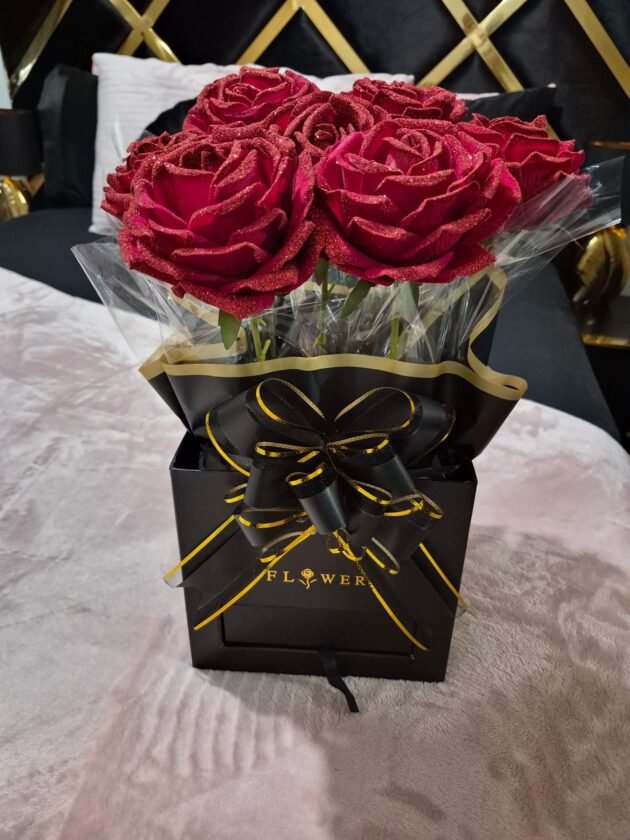 6 Large Roses Glittered Flower Box with 3 Ferrero Chocolates
